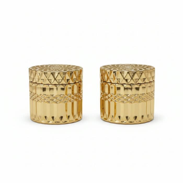 To jeden z najpopularniejszych modeli premium candle jars, ceniony za wagę, jakość i design. Złoty kolor dodaje luksusu, a zdobione szkło sprawia, że produkt natychmiast wyróżnia się na tle konkurencji.